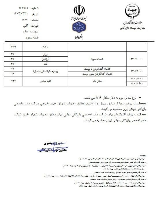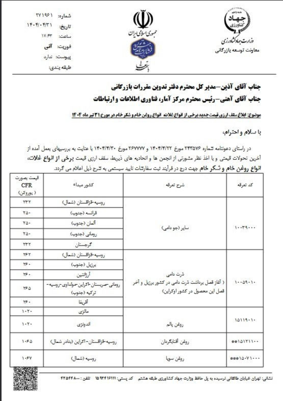 معاونت توسعه بازرگانی وزارت جهاد کشاورزی قیمت جدید ارزی و مصوب نهادههای دامی، روغن و شکر خام را اعلام کرد.