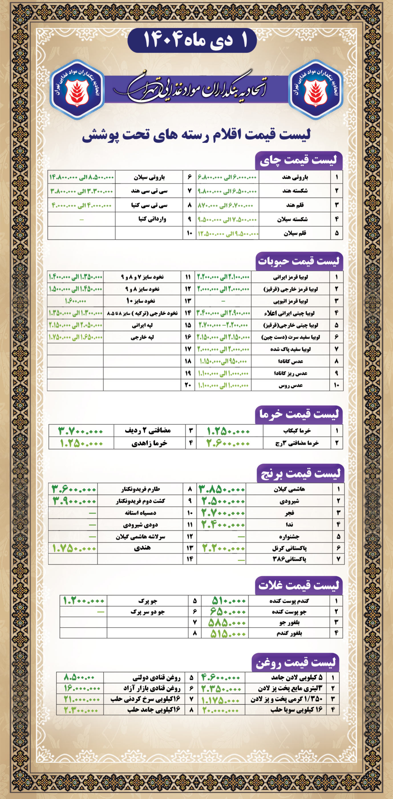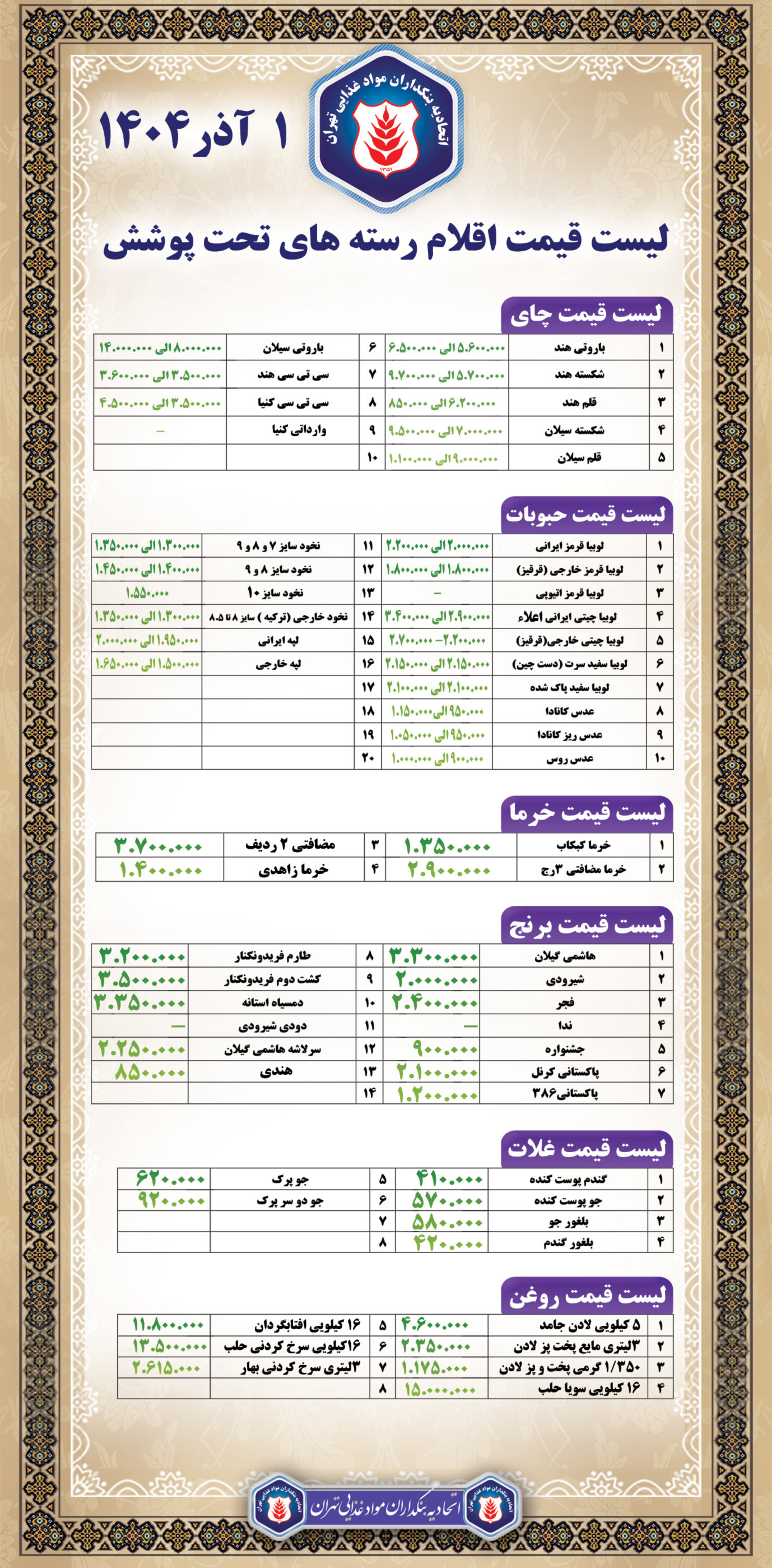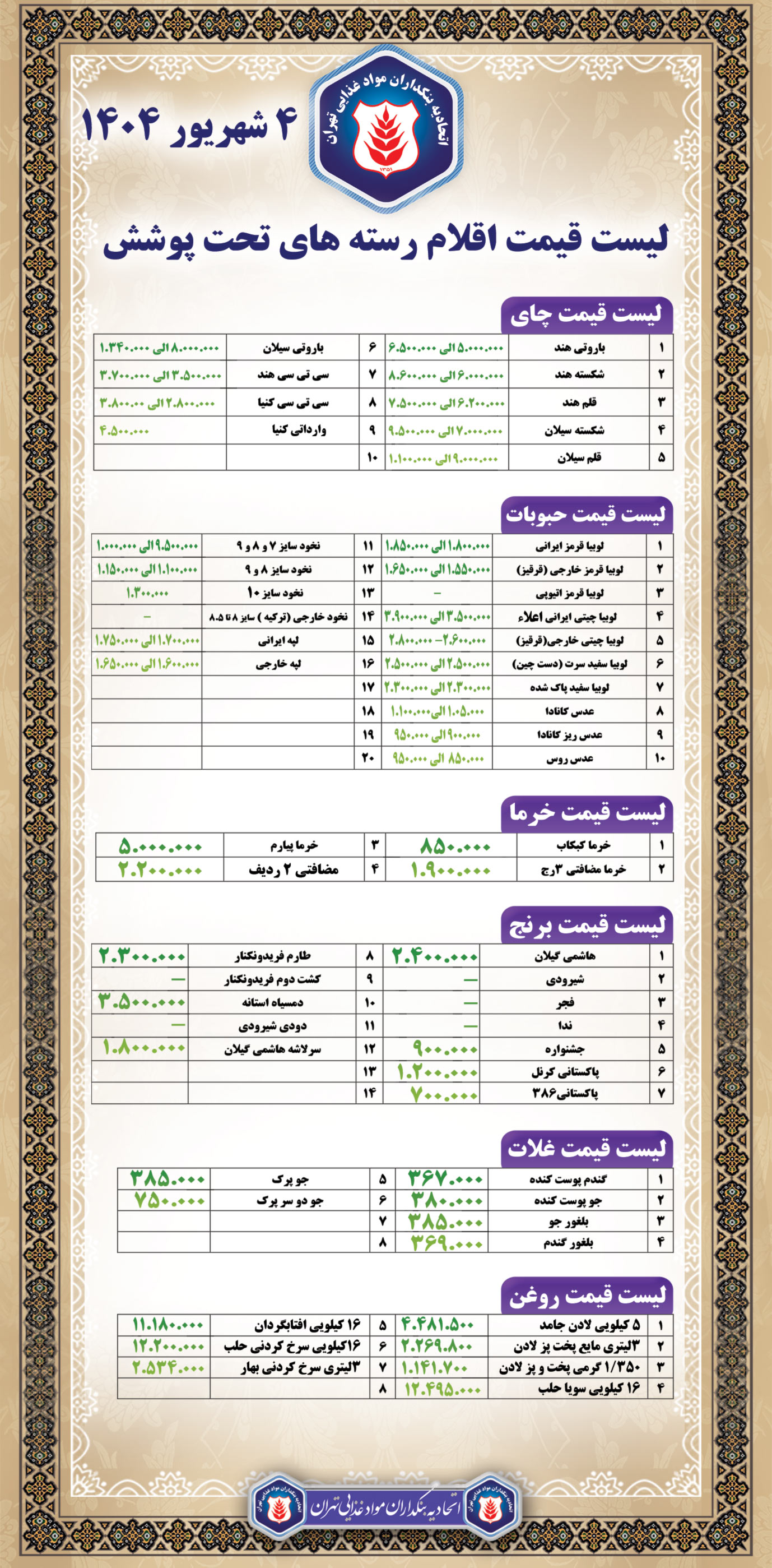 لیست قیمت کالا ها درتاریخ: 1 مهرماه 1404